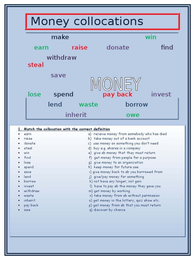 Konsep Penting Money Collocations, Yang Banyak Di Cari!- money exercise. If there is any mistake in the grammar or design of the exercises, please let me know so as to make the MONEY COLLOCATIONS Level: intermediate Age: 14-17 Downloads: 67.